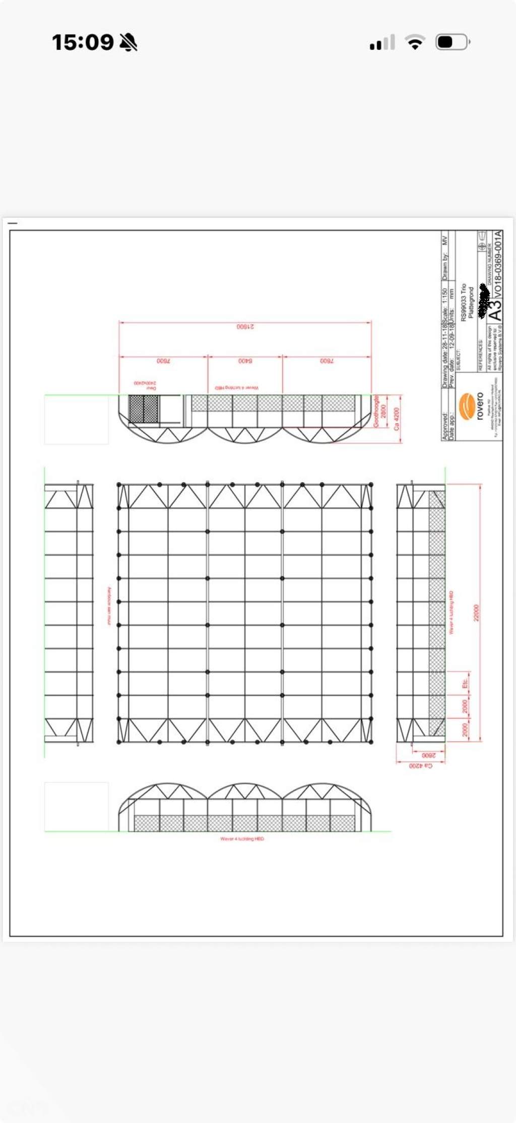 Breedte : 21,60 mtr. (2 kappen van 7,60 mtr en 1 kap van 6,40 mtr.)